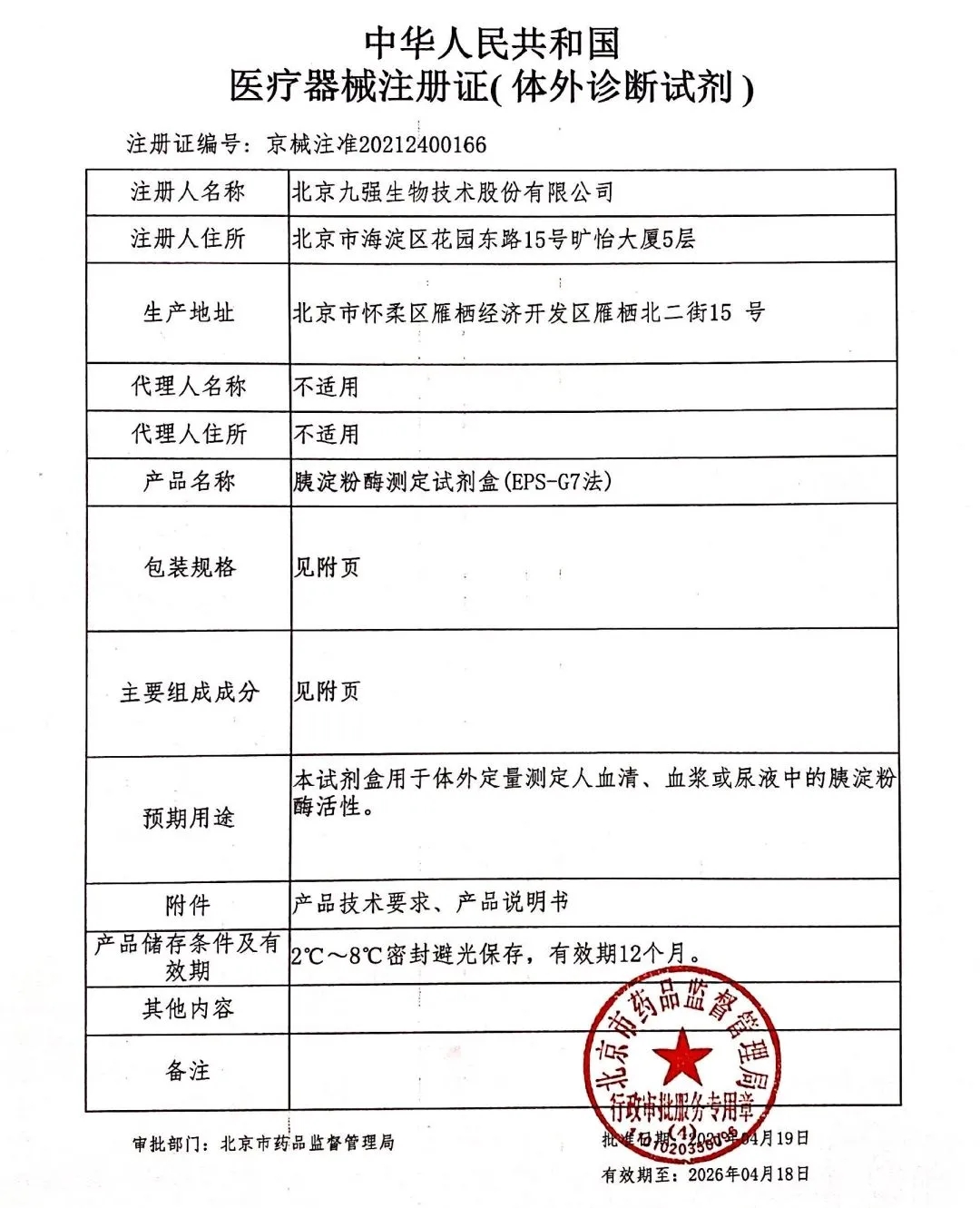 九強(qiáng)生物順利取得北京市藥品監(jiān)督管理局頒發(fā)的三項(xiàng)產(chǎn)品的《醫(yī)療器械注冊證》:谷胱甘肽還原酶(液體)測定試劑盒(谷胱甘肽底物法)、脂蛋白相關(guān)磷脂酶A2測定試劑盒(Lp-PLA2酶法)和胰淀粉酶測定試劑盒(EPS-G7法)。