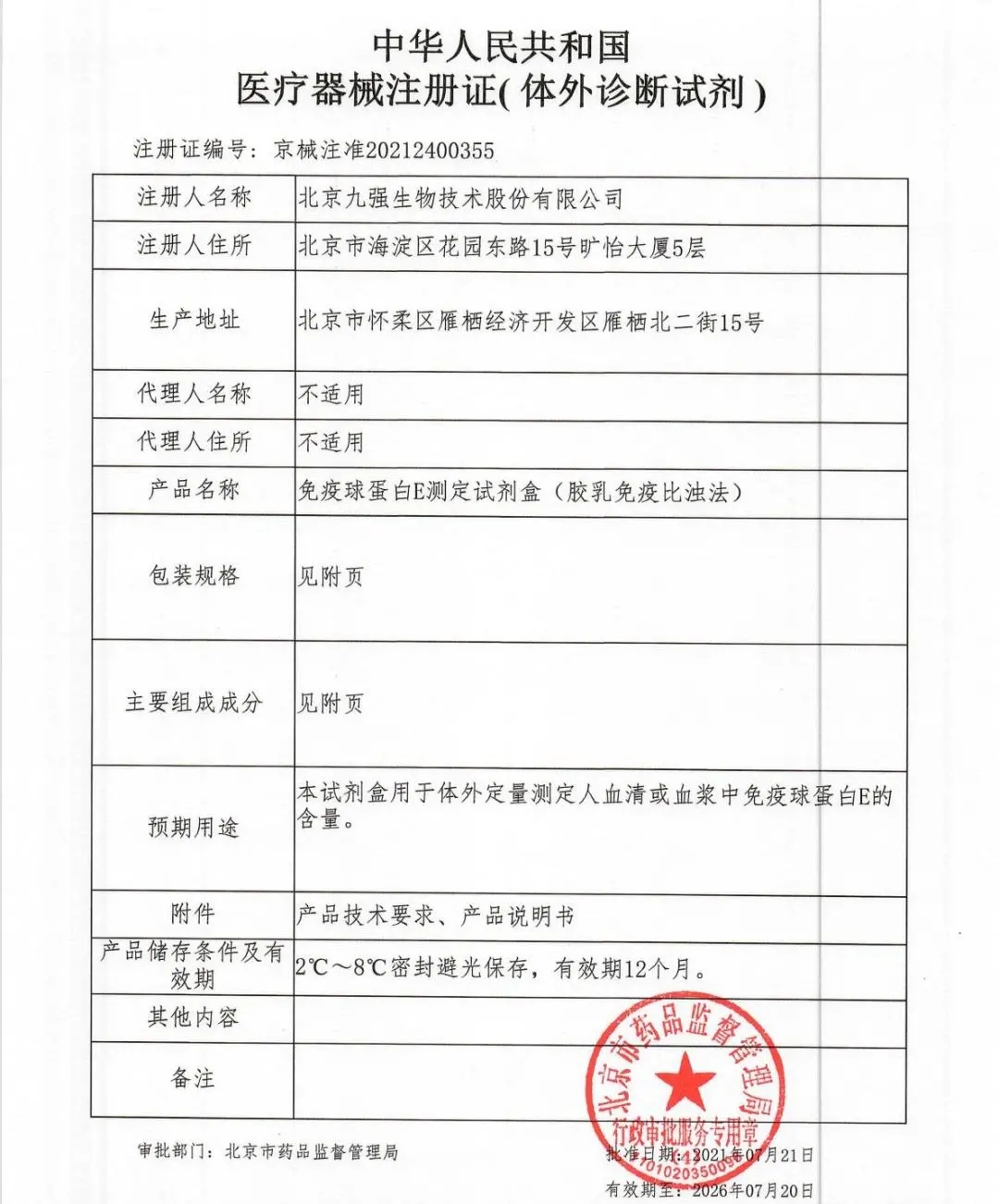 九強(qiáng)生物順利取得國(guó)家藥品監(jiān)督管理局頒發(fā)的免疫球蛋白E測(cè)定試劑盒(膠乳免疫比濁法)的《醫(yī)療器械注冊(cè)證》。