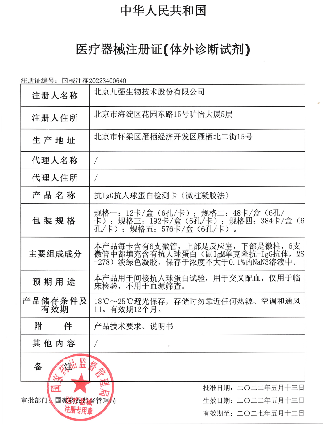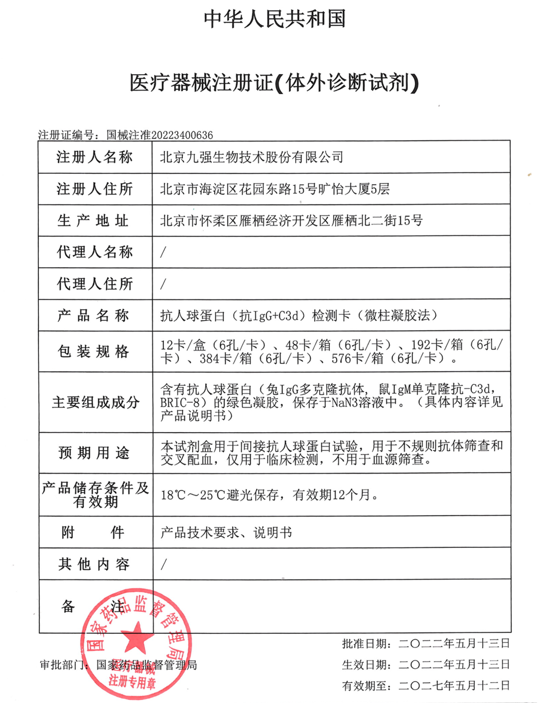 九強(qiáng)生物順利取得國家藥品監(jiān)督管理局頒發(fā)的抗人球蛋白(抗IgG+C3d)檢測(cè)卡(微柱凝膠法)抗IgG抗人球蛋白檢測(cè)卡(微柱凝膠法)的《醫(yī)療器械注冊(cè)證》。