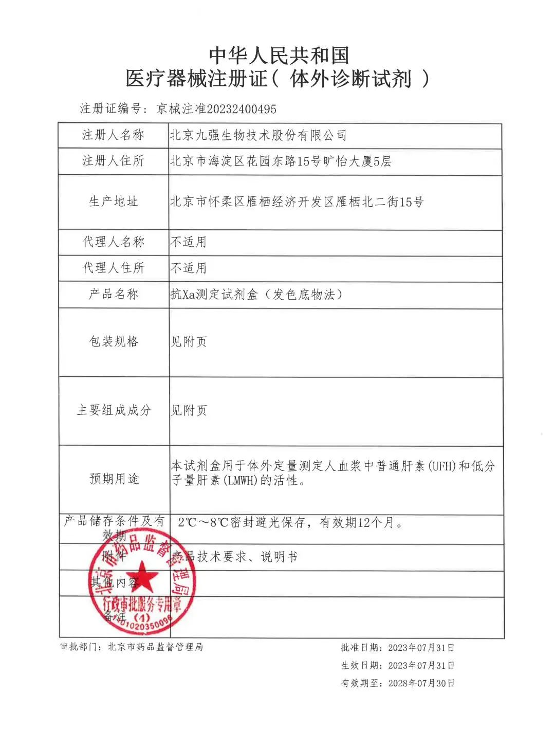 接受訂貨!九強(qiáng)生物抗Xa測(cè)定試劑盒獲得醫(yī)療器械注冊(cè)證!