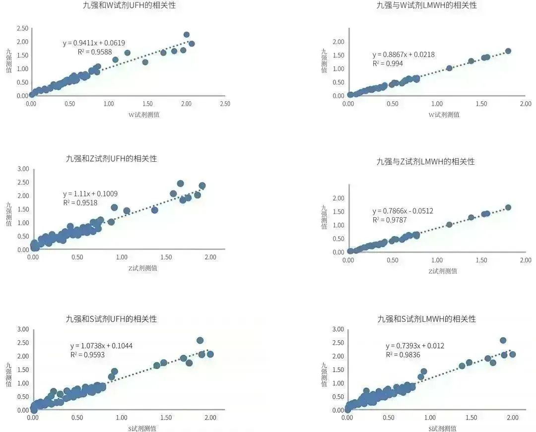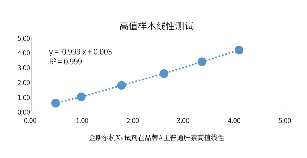 (2)國(guó)產(chǎn)抗Xa試劑可以滿足臨床預(yù)期用途:九強(qiáng)抗Xa試劑盒普通肝素線性可以做到4IU/mL,不僅可以滿足說(shuō)明書所宣稱的1.2IU/mL,同時(shí)可以滿足臨床上的一些異常特殊高值樣本的檢測(cè)需求;