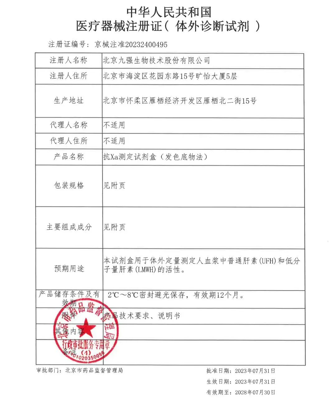 接受訂貨!九強生物抗Xa測定試劑盒獲得醫(yī)療器械注冊證!