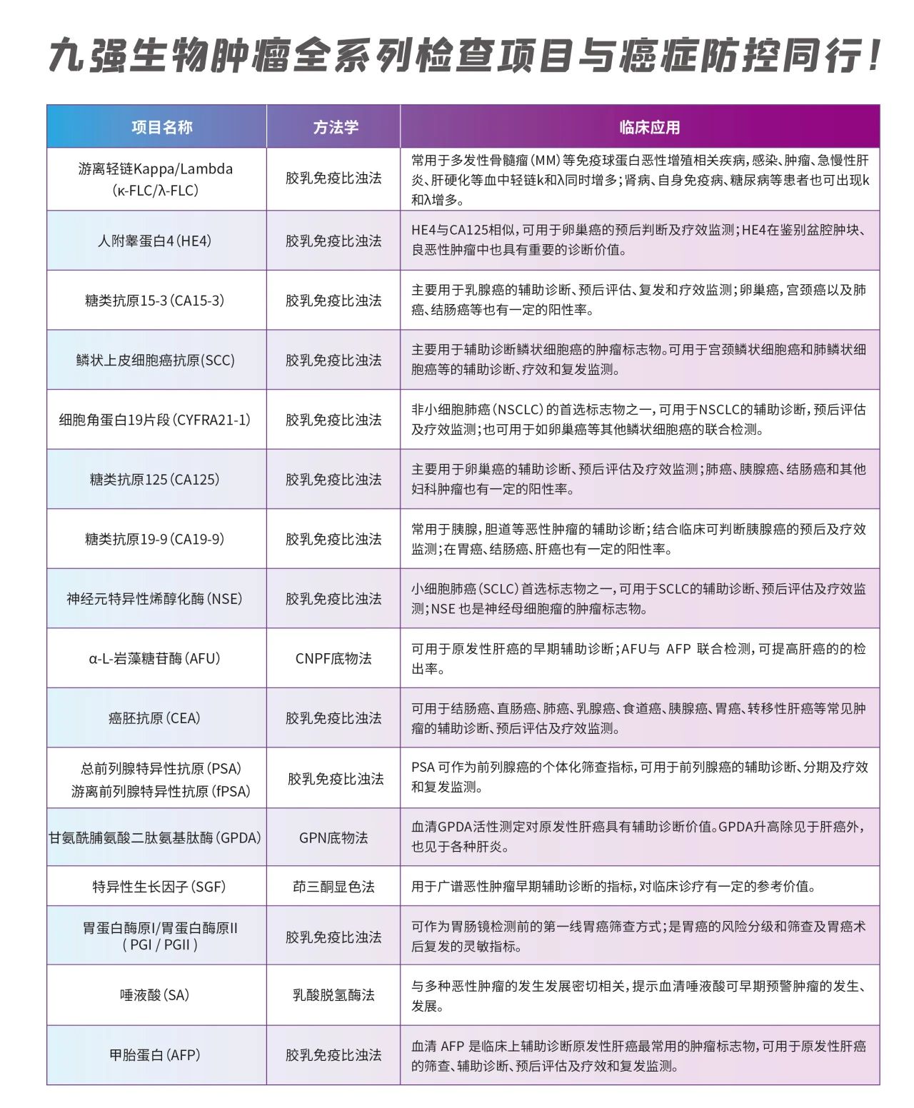 九強生物已開發(fā)出全面的生化平臺腫瘤標志物,試劑各項性能均能滿足臨床用戶需求,與主流進口化學發(fā)光相關性良好,實現批量快速測定的同時有效節(jié)約了用戶成本。