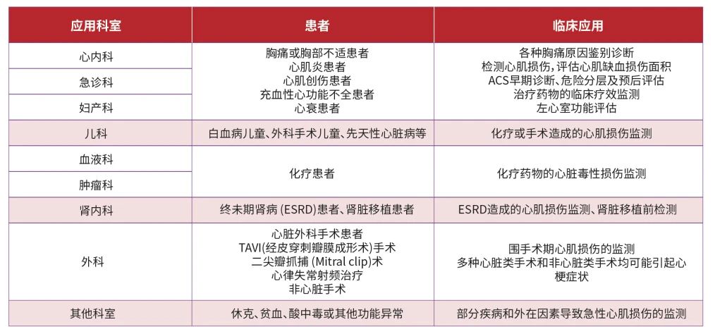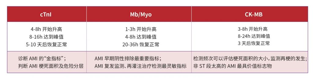 心臟細(xì)胞胞質(zhì)中含量豐富,具有高度心臟特異性,AMI發(fā)作后20min開始升高,1~3h內(nèi)可以在血中檢測出,4~6h達(dá)到峰值,20~30h內(nèi)血漿中的濃度恢復(fù)正常水平,其釋放量與心肌損傷范圍成正比。