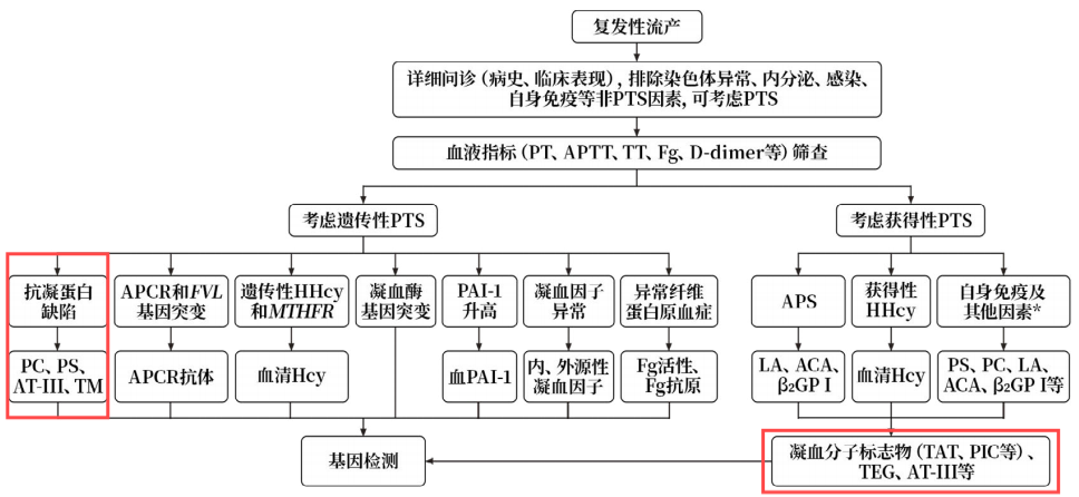 新血栓標(biāo)志物對PTS有重要提示意義,《復(fù)發(fā)性流產(chǎn)合并血栓前狀態(tài)診治中國專家共識(2021)》中指出對于RSA合并PTS患者進(jìn)行凝血功能的篩查,除PT、APTT等常用指標(biāo)外,有條件者可開展TAT、TM、PIC等分子標(biāo)志物,以評價患者體內(nèi)凝血功能及血管內(nèi)皮狀況,如圖1所示。《復(fù)發(fā)性流產(chǎn)病因檢查專家共識(2022)》中建議有條件者可開展新血栓4項(TM、TAT、t-PAIC、PIC)檢測。
