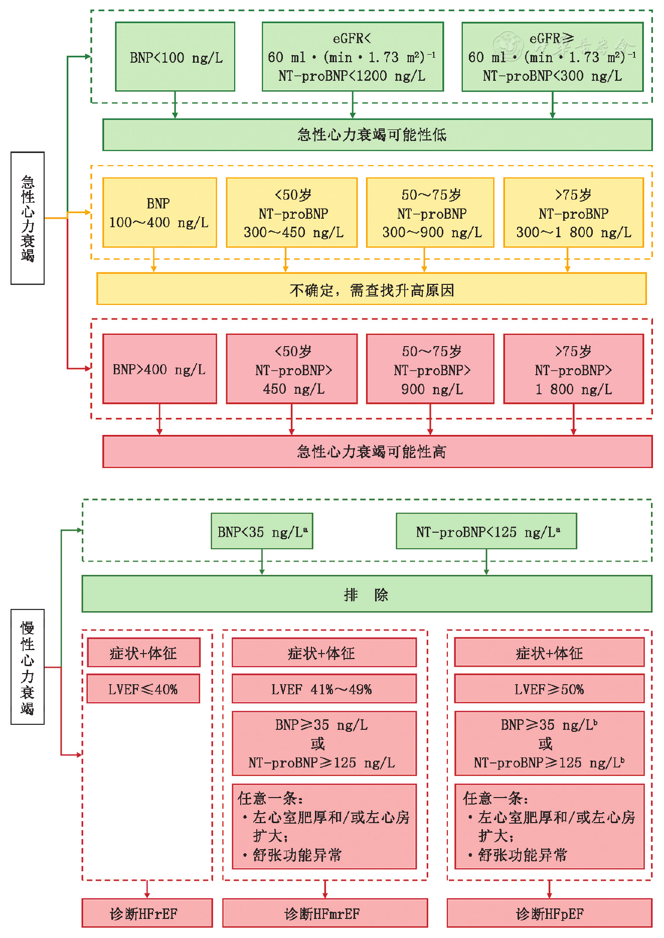 BNP和NT?proBNP均為心力衰竭診斷和鑒別診斷的**標(biāo)志物,但二者檢測方法多樣,不同檢測方法結(jié)果間不能直接比較。因二者的分子結(jié)構(gòu)、清除途徑和半衰期的差異,臨床應(yīng)用中需注意年齡、肥胖、腎功能和藥物對其影響。對于腎功能不全[eGFR<60ml·(min·1.73m2-1]和肥胖者(BMI>30kg/m2)BNP/NT?proBNP用于排除和診斷心力衰竭時需采用校正的截斷值。