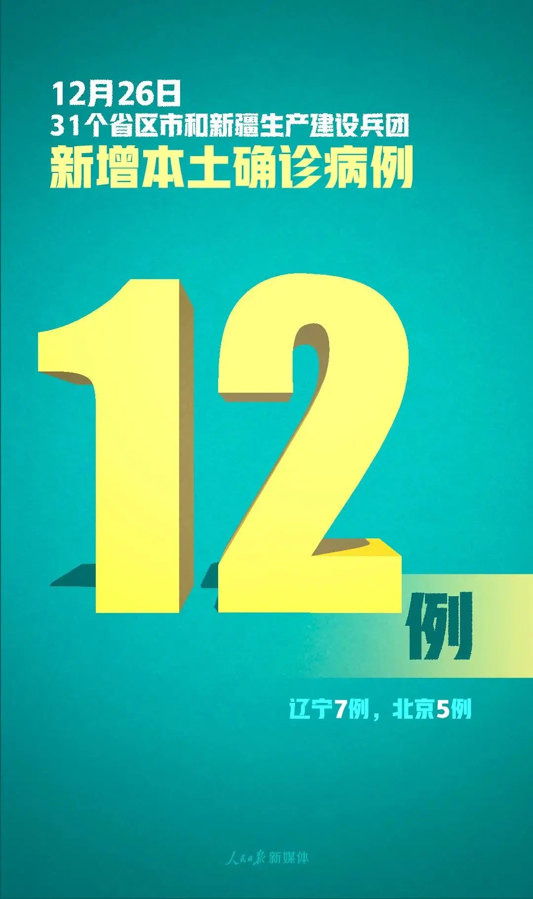 12月26日0—24時(shí),31個(gè)省(自治區(qū)、直轄市)和新疆生產(chǎn)建設(shè)兵團(tuán)報(bào)告新增確診病例22例,其中境外輸入病例10例(上海4例,北京3例,浙江2例,安徽1例),本土病例12例(遼寧7例,北京5例);無新增死亡病例;無新增疑似病例。